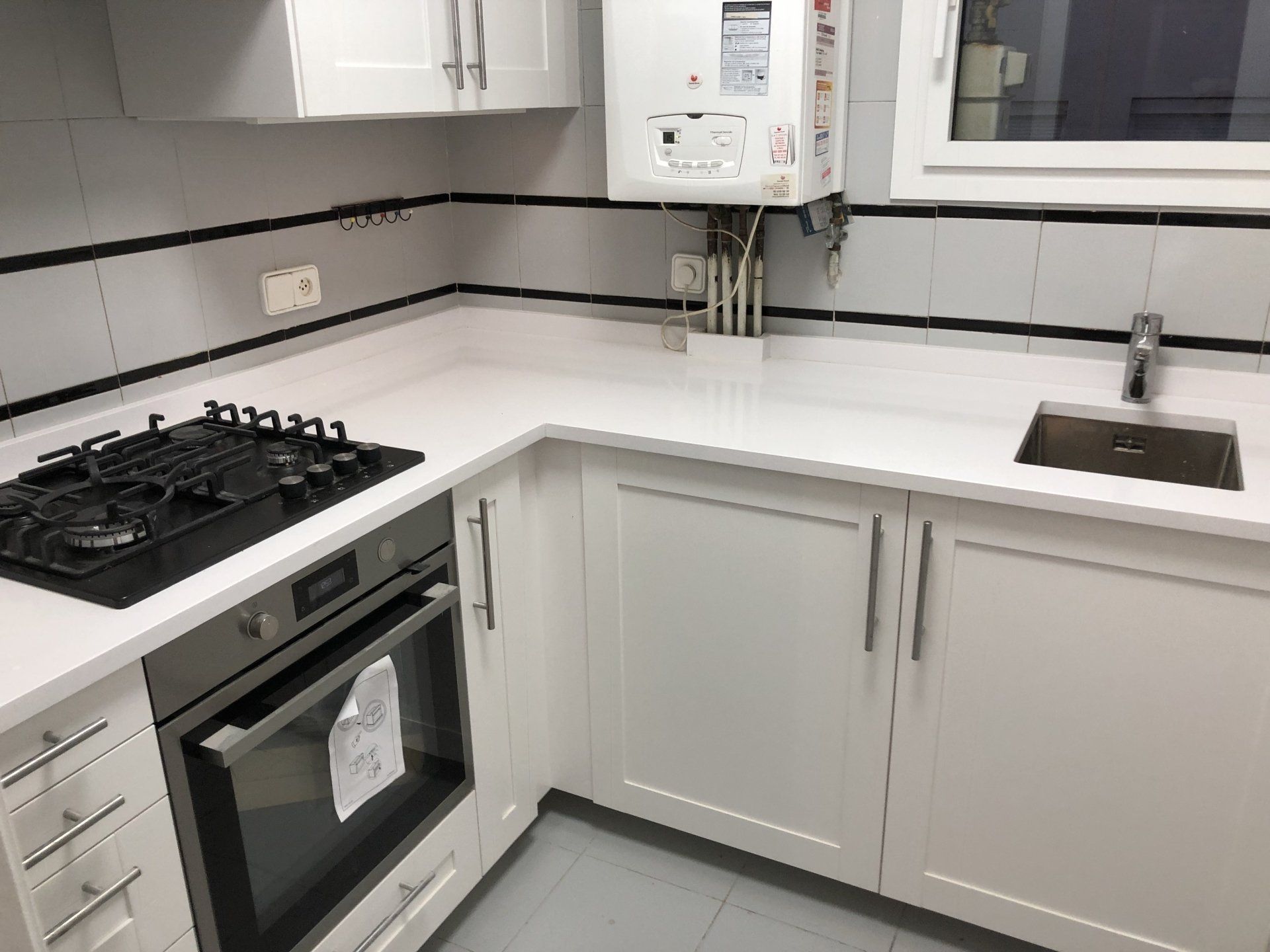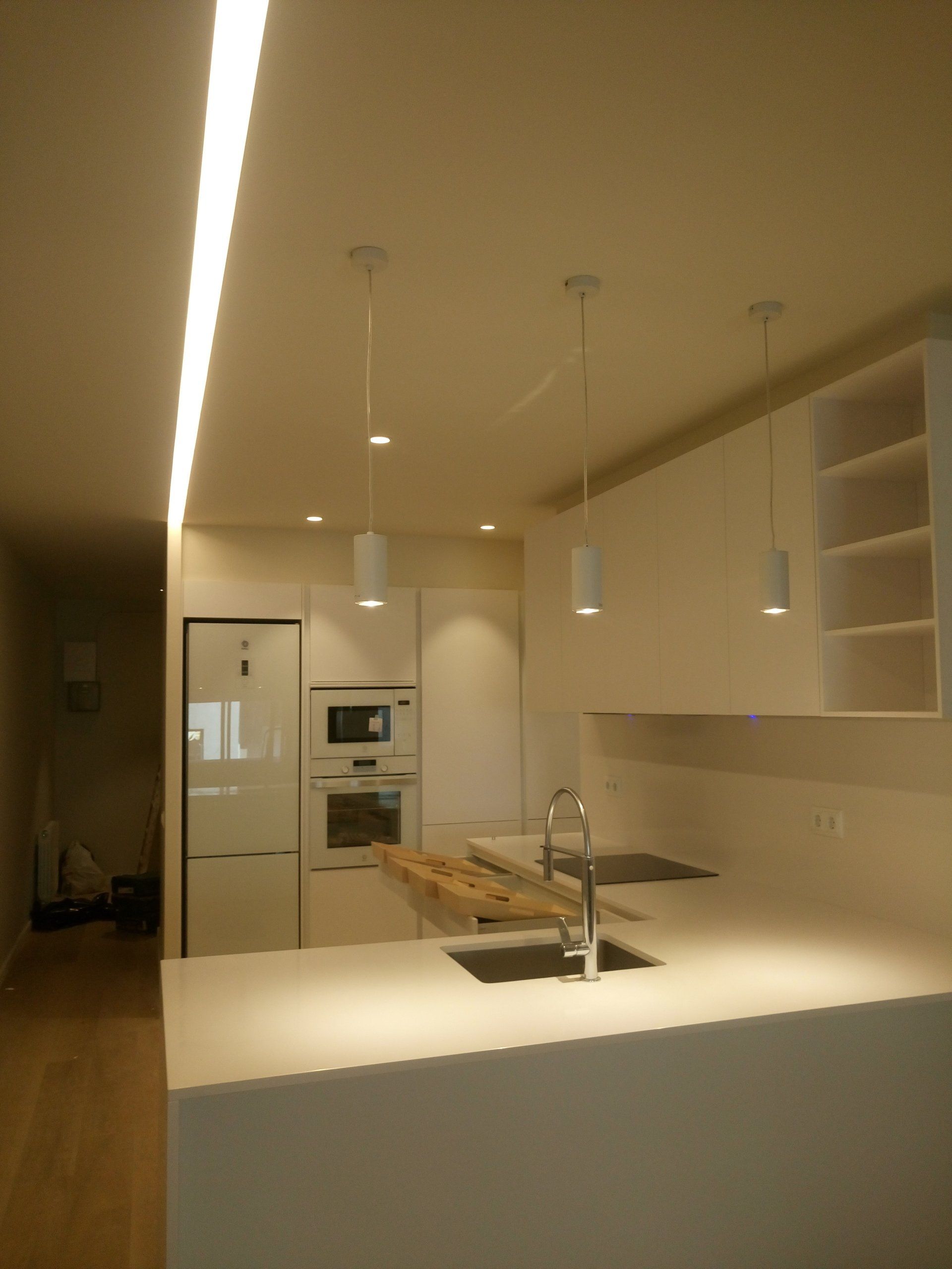 Con tiradores de gola, con silestone blanco zeus y con un mueble alacena, hemos conseguido que los clientes tengan ese espacio extra para poder cocinar y almacenar.